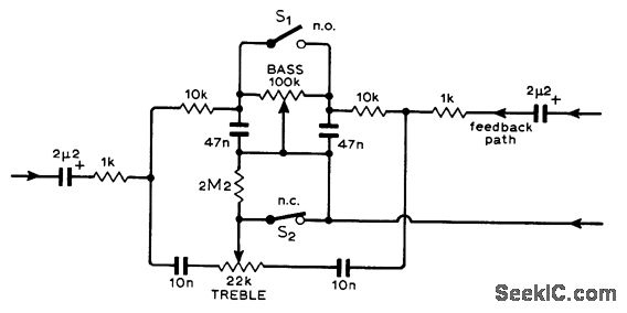 Correction network shown can be inserted in audio channel of mixing console without producing transients or level changes. Although Baxandall network is shown, switching technique is applicable to other filters. With S1 normally open and S2 normally closed, circuit operation is normal. If switch positions are simultaneously reversed, response remains flat regardless of positions of bass and treble pots, centerfrequency gain remains unchanged, and phase shift is unchanged. There is then no transient interruption of AF signals. Switching clicks cannot occur because there is no direct current in the network.-J. S. Wilson, Click-Free Switch-ing forAudio Filters, Wireless World, Jan. 1975, p12.