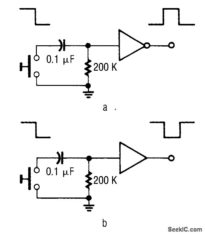 These circuits will cure problems caused by switch-contact bounce. The one shown in Fig.88-21A provides you a positive output pulse, and the one shown in Fig. 88-21B provides you a neg-ative output pulse.