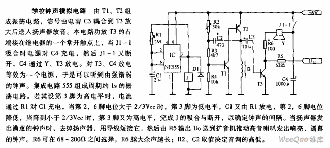 T1,T2 will compose oscillate circuit. The signal will be coupled to T3 through the capacitor C3, which will be sent to the loud speaker after the signal is amplified. The circuit's T3's right terminal is connected to a normally open contactor of the relay. When J1-1 is connected, the power will charge C4. Then J1-1 is disconnected, C4 will be discharged through Y,T3. Discharging T3,C4 will be equal to a power supply so a weakening bell will be heard. The integrated circuit 555 will compose oscillate circuit with a period of about 1s. If its pin 3 is high level, the current will charge C1 through R1. When the potential of pin2, 6 is higher than 2/3Vcc, pin 3 has low level. C1 will then be charged through R1, and potential of pin 2,6 will be lower. When it is lower than 2/3Vcc, pin 3 has high level again. By controlling J's connection and disconnection, the interval of the bell can be controlled. When the sound from the loud speaker is good, the loud speaker can be moved. Then use a wire to short, and R5 will output U0. U0 will be sent to the loud speaker to drive the high tone loud speaker to make a loud and vivid sound. R6 can choose from 68-200Ω. The larger R6 is, the longer the aftersound is. R2,C2 are decided by the tone.