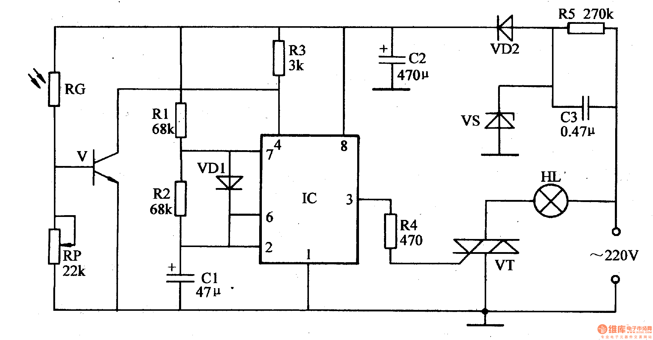 In the daytime, RG has a low resistance value because of the light, and V is connected. IC's pin 4 has a low level. The multivibrator doesn't work. IC's pin 3 still has low level. VT is not connected and HL is not illuminated.