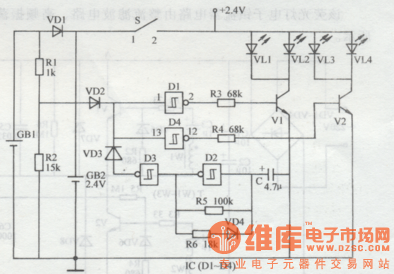 In the daytime, soler energy battery GB1 will charge GB2 through VD1. The other circuit will provide D1 and D4 with high level through VD2, and D1's andD4's output terminals will have low level. V1 and V2 are disconnected and VL1-VL4 are not illuminated.