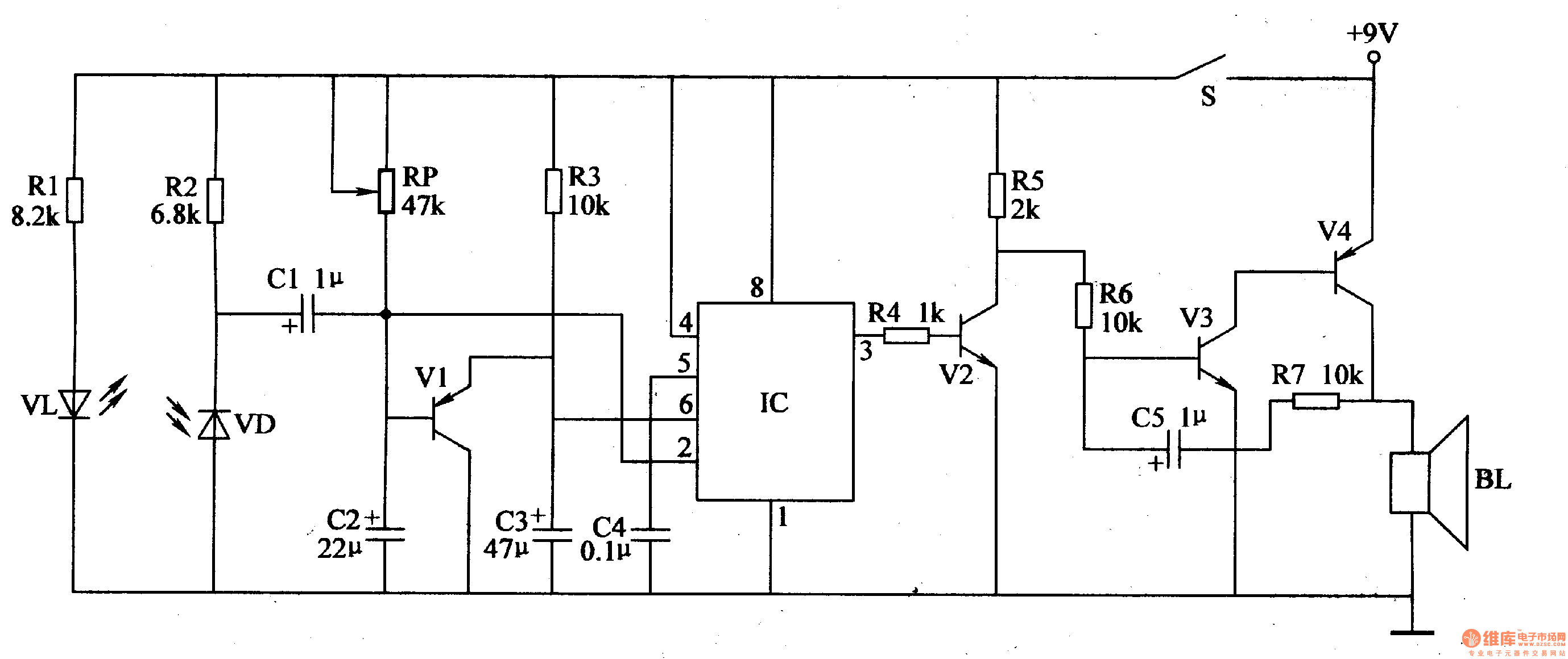 The circuit consists of infra-red detection circuit, trigger control circuit and sound alarm circuit. (It is showed in picture 4-100.)