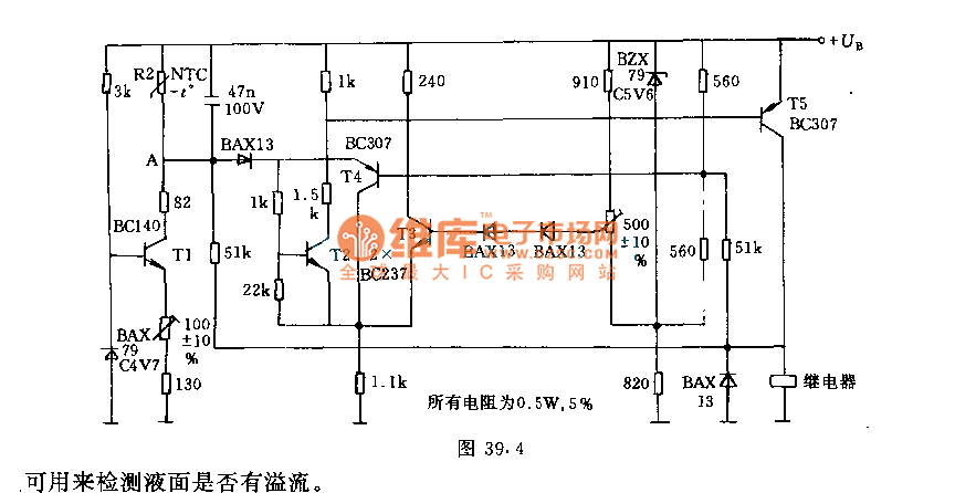 The circuit can be usedto prevent the liquid in containeroverflow. T1 is constant current source, R2 is thermistor and sensor which is used to heat. The media types and temperature regulation ofthe place of sensor could make current flowthrough sensor and produce heat whichis equal to the heat from surrounding media emissions. Now assuming R2 is in air, so emissionsheat is small, R2 temperature will increase to the highest, R2 resistance is low. As a result, A's potentialis high, T2 and T5 are connected, so is the relay. If R2 dip in fluid-filled containers, then R2's temperature drop, its resistance increases, A's potentialis low, T2 and T5 are disconnected,neither is the relay. Thus, it can be used to detect liquid face whether has overflow.