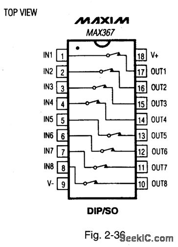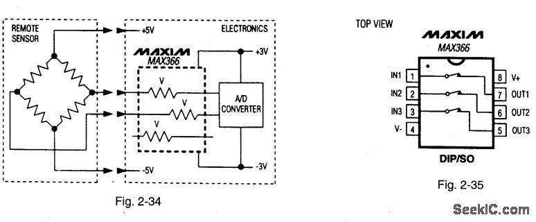 Figures 2-34 and 2-35 show a typical application circuit and pin configuration, respectively, for the MAX366. Pin configurations for the MAX337 are shown in Fig.2-36. These ICs are multiple, two-terminal circuit protectors. Placed in series with signal lines, each two-terminal device protects sensitive circuit components from damaging voltage near and beyond the normal supply range. The ICs are used at interfaces where sensitive circuits connect to the external world, and potentially damaging voltage (up to 135 V beyond the supply rails) might be encountered during power-up, power-down, or fault conditions. The ICs can be used to protect either analog or digital signals using unipolar (5 V to 44 V) or bipolar (±5 V to±22 V) supplies. The ICs are essentially fault-protected switches that are always on when power is applied. On resistance is 100Ω (max.), and leakage is less than 1nA at +25℃. When signal voltages exceed, or are within 1.5 V of the supply voltages, or when power, is off, the two-terminal resistance increases and becomes a virtual open circuit. This ensures low current during fault conditions. The protected side of the switch maintains the correct polarity and clamps about 1.5 V below the supply rail. There are no glitches or polarity reversals going into or coming out of a fault condition. ESD (electrostatic discharge) protection is greater than 2 kV.MAXIM NEW RELEASES DATA Book, 1995, P. 1-109, 1-110.