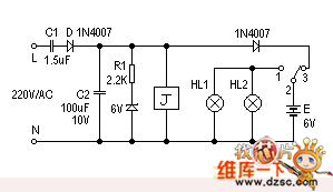 The circuit is as shown. When the grid is normal, 220V mains voltage is reduced by the capacitor c1, and is half-wave rectified by the diode d, the circuit has the stable DC output voltage (6v) and 90ma output current. The power supplier still supplies power to relay j, the normally close contact point j2-1 disconnects, so hl1, hl2 lost power;on the other hand, the normally open contact point j2-3 disconnects, pulse current float to the battery E.