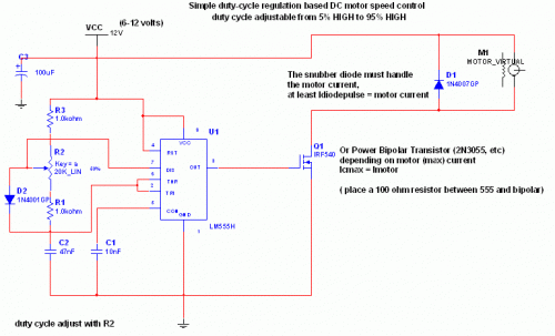 Circuit Explaination:The 555 Ic is wired as an astable and the frequency is constant and independent of the duty cycle, as the total resistance (R charge + R discharge, notice the diode) is constant and equal to 22Kohm (givin a frequency of about 1Khz, notice the hum).When the potentiomenter is all up, the Rcharge resistance is 1,0 Kohm (the diode prevents the capacitor to charge through the second potentiometer section and the other 1,0 Kohm resistor) , and Rdischarge is 21 Kohm, giving a 5% on duty cycle and a 1Khz frequency.When the potentiomenter is all down, the Rcharge resistance is 21,0 Kohm (the diode prevents the capacitor to charge through the second potentiometer section and the other 1,0 Kohm resistor) , and Rdischarge is 1 Kohm, giving a 95% on duty cycle and a 1Khz frequency.When the potentiomenter is at 50% , the Rcharge resistance is 11,0 Kohm (the diode prevents the capacitor to charge through the second potentiometer section and the other 1,0 Kohm resistor) , and Rdischarge is 11 Kohm, giving a 50% on duty cycle and a 1Khz frequency.The 555 provide good current capability to drive the mosfet fast and to drive a bipolar transistor.I actually use this system to drive the DC motor of my small Rotary spark gap Tesla coil at variable speedIf you are disgusted by the 1Khz hum of the motor try to rise the frequency out of the audible range (replacing the potenziometer), but rembember that at higher frequency inductive reactance of motor rises so the the efficiency would drop.
