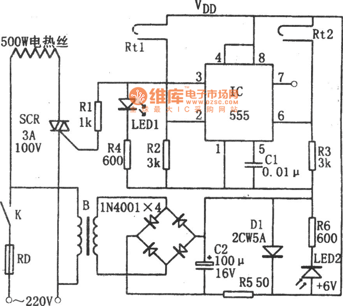 Rt1 contacts the contact because of the heated expansion, but IC 6 feet is disconnected since the Rt2 is still at the low level, thus the trigger circuit skins. The temperature continue to rise to the upper limit value, Rt2 is conducted, the corresponding 6 feet potential is inhigh level (6 V), it is larger than 6 x two-thirds = 4 V trigger level. The IC resets, the (3) foot outputs low level, SCR stops and the electric heating wires power supply is disconnected. It stops heating. When the temperature drops, Rt2 will be disconnected. For 555 circuit is self-preservation and it still outputs low level feet by (3). When the temperature drops to the limit value, Rt1 is disconnected.