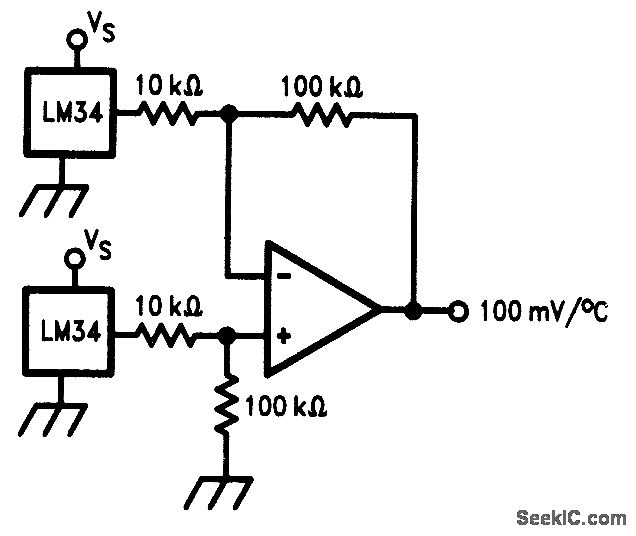 Fig. 13-12 This circuit produces an output voltage that is proportional to the temperature difference between the two LM34s. The difference amplifier sub-tracts the LM34 outputs from one another and then multiplies the difference by a factor of 10 to provide a single-ended output of 100 mV/°F of differential temperature. National Semiconductor Linear Applications Handbook 1991, p 1079.