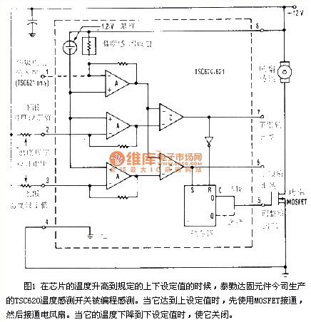 Figure 1 When the temperature of chip reaches the high set-value or low set-value, the TSC620 temperature sensing switch (produced by the Tai Leda Solid Components Inc.)is sensed by the program. When it reaches the high set-value, MOSFET turns on and then the fan. When it reaches the low set-value, it will shut down.