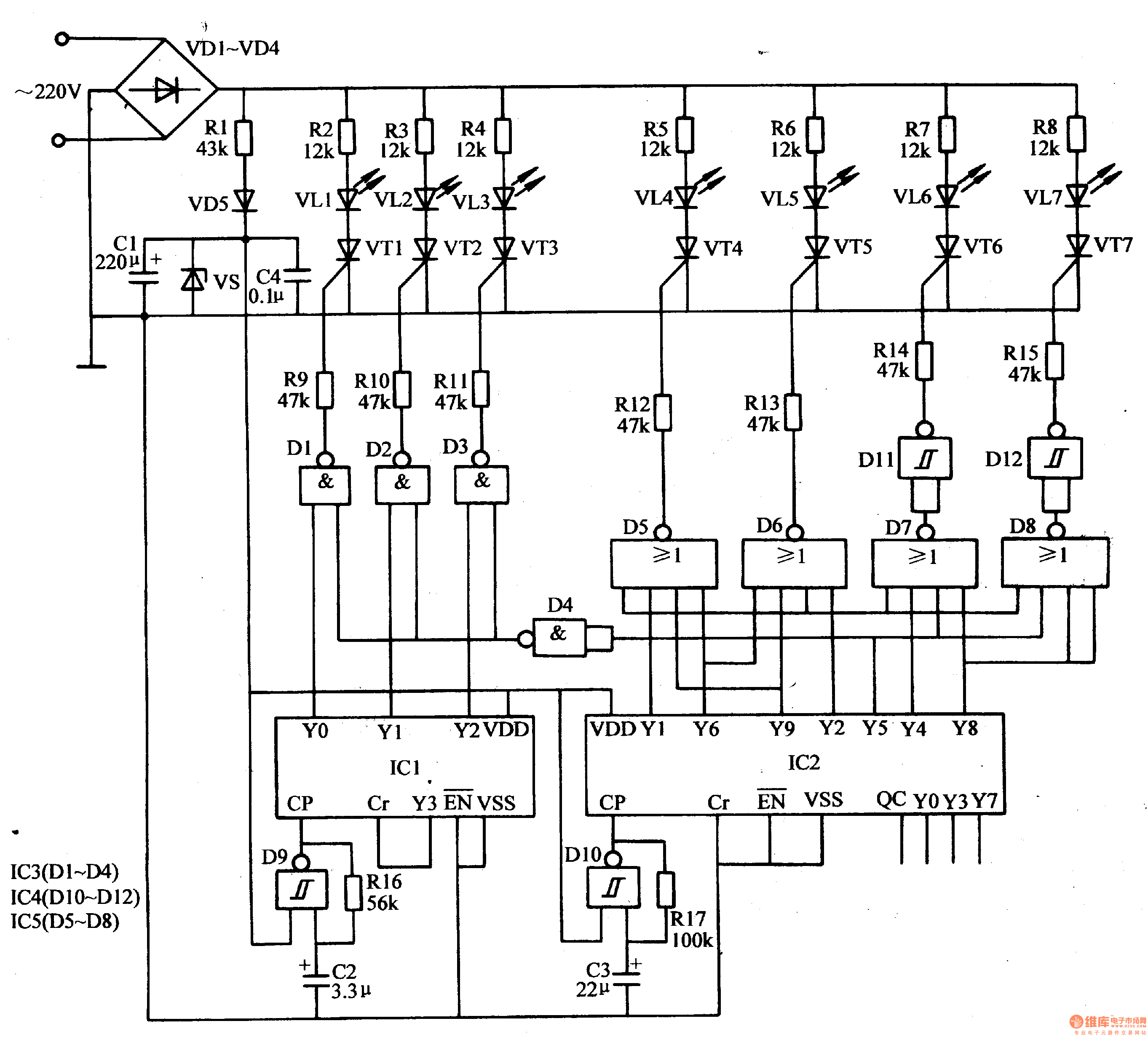 This example describes the LED sign decorative light,which is used to decorate all kinds of doors mark,road sign and emergency exit,fire access and other signs, and it can produce effects like text flashing,border flowing,and it will play a role of eye-catching, decorative effects. The principle of circuitThe LED sign decorative light circuit is formed by the power supply circuit,light flowing control circuit and text flashing control circuit, which is shown in Figure 1-153. Power supply circuit is formed by the rectifiers diodes VD1-VD5, resistor R1, voltage regulator diode VS and filter capacitor C1, C4.