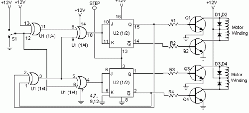 I found this circuit in my files. I don't know where it came from, but it looks like I photocopied it from somewhere years ago. I have been told that it came from The Robot Builder's Bonanza , by Gordan McComb. Anyway, I thought that it should be fairly useful, so I decided to post it here. The circuit is very simple and inexpensive. This is good thing because most commercial stepper motor controller ICs are quite expensive. This circuit is built from standard components and can easily be adapted to be controlled by a computer. If you use cheap surplus transistors and stepper motor, the price of the circuit can be kept to under $10.
