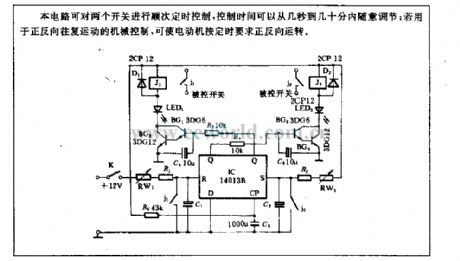 This circuit can control the two switchesin succession timing, andthe control time can be adjusted from a few seconds to several minutes; If it is used to mechanical control of forward and reverse reciprocating movement, it can make motor forward and reverse operation according to timing requirements.
