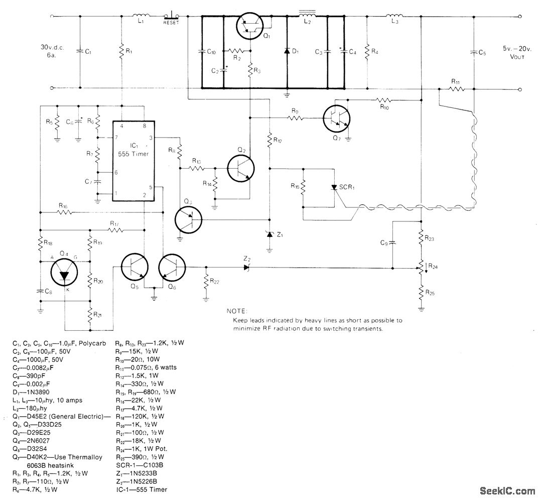 Unregulated DC voltage is applied to power Darlington Q1 serving as switch that chops voltage so rectangular waveform is applied to RLC output filter. Average voltage to filter depends on duty cycle of switch. 555 timer operates in mono MVBR mode as pulse generator and pulse-duration modulator. R24 applies varying voltage to pin 5 to modulate pulse duration linearly with respect to applied voltage, Actions of O1, Q2, and Q6 maintain constant 3.6 V at arm of control pot. Q4 and Q5 provide 20-kHz clock pulse, above audible range. Overcurrent protection of transistors is provided by R11, SCR, and Q3. Adjust R11 so SCR turns on and shuts down circuit when current through R11 reaches 8 A. Circuit must be reset manually after overload. Q7 and R10 load circuit to prevent oscillation at low output volt-age and light load.-R. J. Walker, A 150 Watt Switch-Mode Regulator, CQ, March 1977, p 40-43 and 74-75.