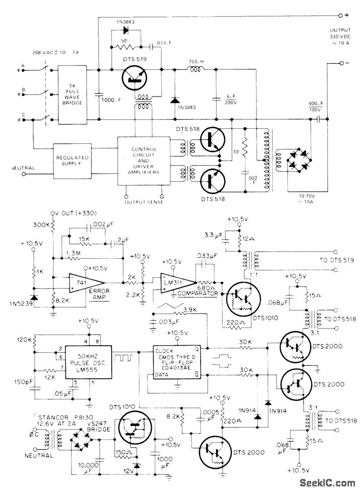 Delco DTS-518 and DTS-519 power transistors in high-efficiency stacked supply are operated at 25-kHz switching rate to provide 330 VDC at 10 A. Control circuit operates at primary 50-kHz pulse frequency, with negative-going pulses having 2-μs duration. Flip-flop converts this to 25-kHz complementary square-wave signal driving Darlington DTS-2000s. Transformer cores are Magnetics EE No. 42510 each having 15-tum primary and 5-tum secondary for driving DTS-518s. Error amplifier compares portion of total output voltage to zener reference for control of DTS-519 power transistor switching at 25 kHz. Efficiency is 95% at full Ioad.- 3.3kW High Efficiency Switch Mode Regulator, Delco, Kokomo, IN, 1977, Application Note 59.