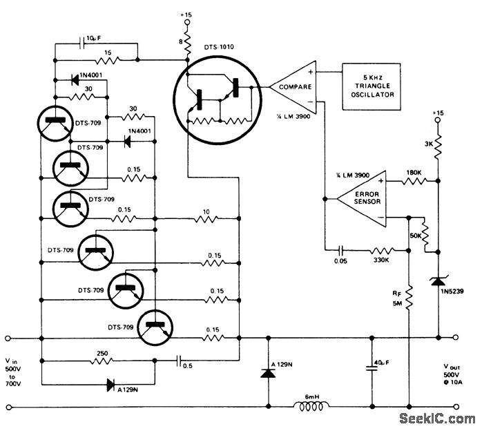 Six Delco DTS-709 transistors are connected in progressive Darlington configuration to provide stable and efficient switching at high voltages. Can be operated from 480-V three-phase full-wave rectified line to minimize filter cost. Control circuit uses one LM3900 IC operating from isolated 15-V supply, along with 5-kHz triangle oscillator and error sensor feeding into comparator. In power stage, one DTS-709 drives two DTS-709s which drive three DTS-709s. Efficiency is better than 90% for all loads above 500 W.- Economical 5 kW Switching Regulator Using DT'S-709 Transistors, Delco, Kokomo, IN, 1974, Application Note 56.