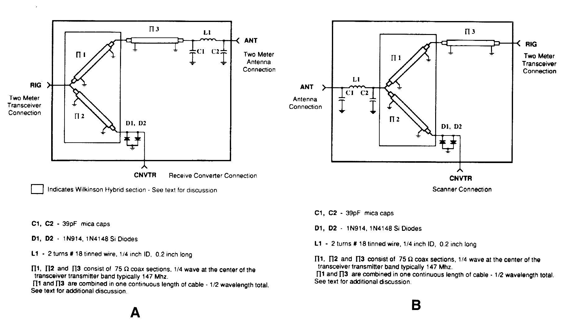 A pair of diodes and a quarter-wave transmission line are used as an automatic TR switch. D1 and D2 conduct during transmit periods, short-circuiting the scanner input. In th 1/4-wave line appears as an open circuit. In receive, the circuit acts as a Wilkinson power divider.