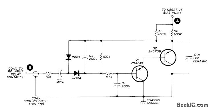 Automatic electronic bias switching improves efficiency of negatively biased linear class B RF power amplifier such as Heath SB-200 because no power is dissipated under no-signal conditions. Transistors are chosen to withstand maximum negative voltages switched, about -150 VDC. Capacitor across collector-base junction of Q1 can be adjusted to reduce turn-on time of switch. With no RE drive from transmitter, amplifier is biased to cutoff and plate current is zero. Switch will operate at RF threshold of about 2 V and apply class B bias voltage to amplifier. As RF drive is increased, plate current increases. With transmitter in SSB mode, plate current is zero with no speech. For speech, plate current increases with RF driving voltage.-F. E. Hinkle, Electronic Bias Switch for Negatively Biased Amplifiers, Ham Radio, Nov, 1976, p 27-29.
