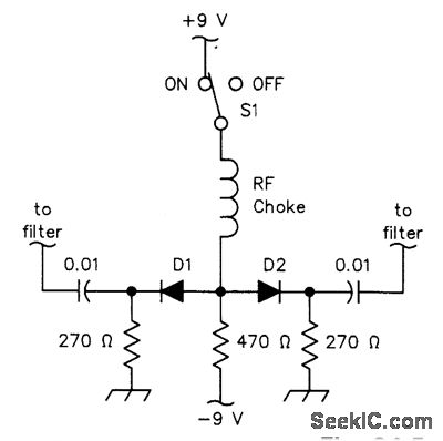 D1 and D2 can be IN914B- or HP2800-senesdiodes(for UHF).The loss is over 60 dB h the OFF state,and less than 3 dB at 3.5 to 30 MHz(using common IN914B diodes).