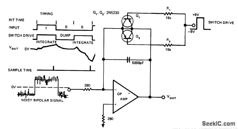 Requires only 350 ns to dump 6-V output to level of 3 mV. Transistors are connected so one of them is biased in forward mode independently of output polarity. Both transistors tum on during dump interval.Transistor operating in forward mode determines initial discharge rate until it saturates, after which inverted-mode transistorcontinuesto discharge capacitor. Offset voltage error is only -25 μV. Opamp is Analog Devices 120 or equivalent having unityqain bandwidth above 100 MHz and slew rate above 200 V/us.-F. Tarico, Fast Bipolar Dump Switch Has Low Offset, EDN Magazine,Nov5,1974.p 66.