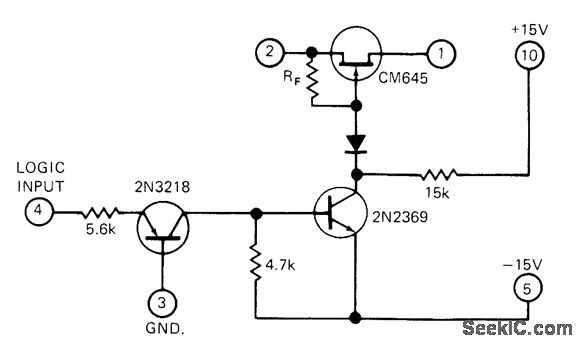 Simple level-shifting driver provides analog switching. Input of logic 1 makes emitter and collector current flow in input PNP transistor, for shifting from logic to -15 V. This current makes NPN transistor turn on so its collector is -15 V, diode is forward-biased, and FET gate is about -14.3 V. At logic 0, both transistors are off and driver output is at +15 V. Diode is now reverse-biased, turning FET on to provide desired switching action between outputs 1 and 2.-J. Cohen, Solid-State Signal Switching: Ifs Getting Better All the Time, EDN Magazine, Nov. 15, 1972, p 22-28.