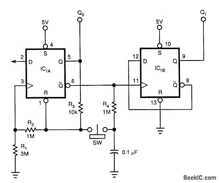 Although this circuit uses a 74HC74, any CMOS variant of this flip-flop will work. IC1A acts as a true/ complement buffer. RI and R2 ensure that IC1A comes out of reset before the clock's edge occurs. R3 applies IC1A's logic state to pins 1 and 3. When the switch closes, the next logic state stored on the capaci-tor transfers to the flip-flop's reset and clock inputs. Releasing the switch lets the capacitor charge to the next state via R4. IC1A's output is the LSB; IC1B's output is the MSB.