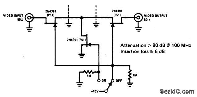 The 2N4391 provides a low ON resistance of 30 ohm and a high OFF impedance (<0.2 pF) when off. With proper layout and an ideal switch, the performance stated above can be readily achieved.
