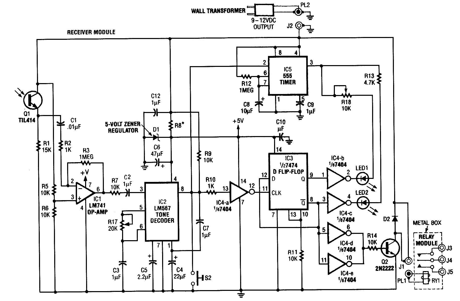 Useful for A/B control, the IR receiver shown controls a relay from an infrared beam that has a pulsed tone-modulated signal. Q1 is the photo receptor feeding op amp IC1, tone decoder IC2, and flip-flop IC3. IC5 turns off the indicator LEDs after about 15 seconds.