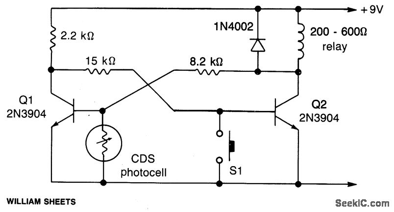 This circuit uses a flip-flop arrangement of Q1 and Q2. Normally Q1 is conducting heavily. Light on CDS photocell causes Q1 bias to decrease, cutting it off, tuming on Q2, removing the remaining bias from Q1. Reset is accomplished by depressing S1.