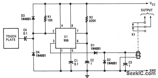 The monostable period is set for about 1 second, as is the usual case. The induced line hum comes through C2, providing a continuous string of trigger pulses. The output becomes low for about 10 ms per second as the monostable times out and then retriggers. Diode Dl and capacitor C3 buffer the relay so it doesn't chatter on those 10-ms pulses. Resistor R2 sets the sensitivity.The relay energizes when the plate is touched and de-energizes, up to one second after the finger is removed. The delay is a function of when the monostable last retriggered.