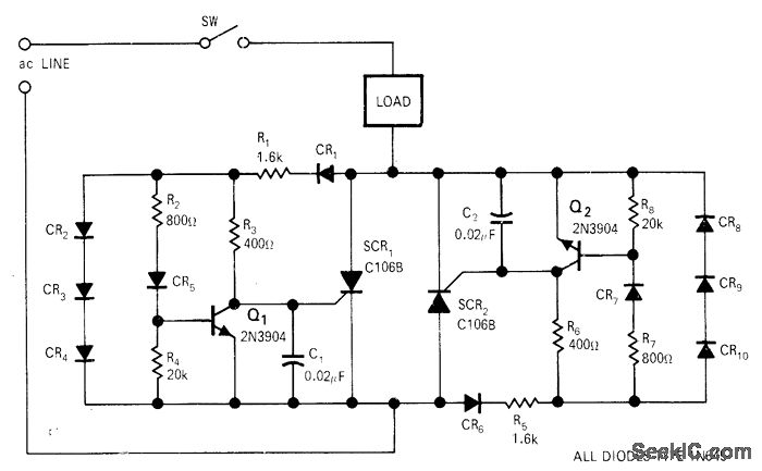 When AC line twitch is closed, power is not applied to load until after line voltage next goes through zero. Identical circuits control each half of AC cycle. Transistor turn-on at 1.4 V prevents SCR from triggering until 0.013 ms (less than one-third electrical degree) after next zero-crossing point.-A. S. Roberts and O. W. Craig, Efficient and Simple Zero-Crossing Switch, EDN|EEE Magazine, Aug. 15, 1971, p 46-47.