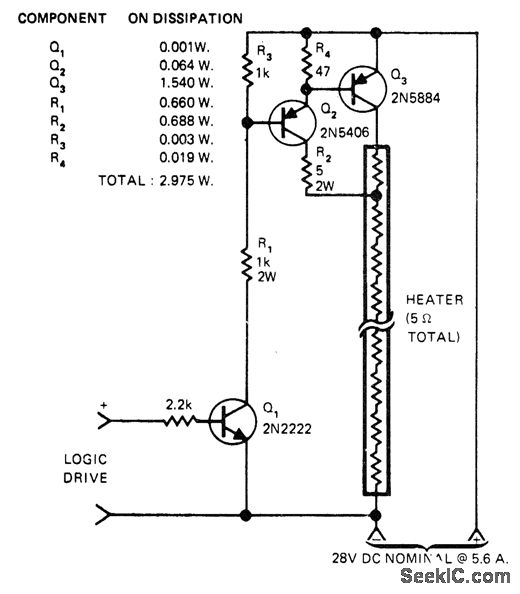 Logic-controlled power switch for 150-W instrument heater uses tap on heating element to force switch Q3, and driver Q2, into saturation and keep dissipation low. When input goes positive, Q1 turns on and drives Q2 and Q3 on. Collector current of Q2, and base drive of Q3 are determined by R2,. Voltage drop across R2 is proportional to supply voltage so drive for Q3 is at optimum level over wide voltage range,-M. Strange, Increase Electronic Power Switch Efficiency, EDN Magazine, Aug.20, 1975, p 78.