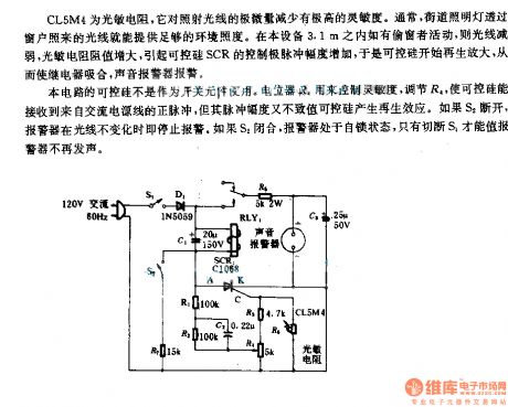 The SCR in the circuit is not used as a switching element. Potentiometer R4 is used to control sensitivity, adjust the R4, to make SCR receive the positive pulse from the AC power, but the pulse amplitude could not make the SCR produce renewable effects. If S2 turns off, the alarm will stop the warning when the light will not change any more. If S2 is closed, the alarm is in self-locking state, the alarm stops warning by cuting off S1.