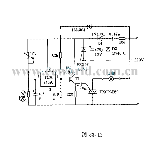 Light contrtol switch circuit adopts bidirectional thyristor. This circuit can control make-and-break of 200W power load on 220V AC network . If the power is only 50W, bidirection thyrisotr can not connect radiator. The action point with some hysteresishas about 100lx sun light. When light is weak, thephotoresistor presents high resistance, then the threshold switch TCA345's input voltage ishigher than 0.7 times of pin 2's voltage , and thethreshold switch output end is in high resistance value,then it is breakover bytransistor period triggering bidirectional thyristor. Contrarily, if surrounding light exceeds100lx, threshold switch output end changes to negative, at this time, proclitic transistor and bidirectional thyristor arecut-off, then lamp goes out.