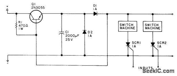 individual SCRs are triggered by logic-level signals independently to initiate discharge of large capacitor C1 through solenoid of model railroad tracks witch.-D. W. zimmerli,Two Hobbies:Model Railroading and Computing,Kilobaud Aug1978,p 62-68.