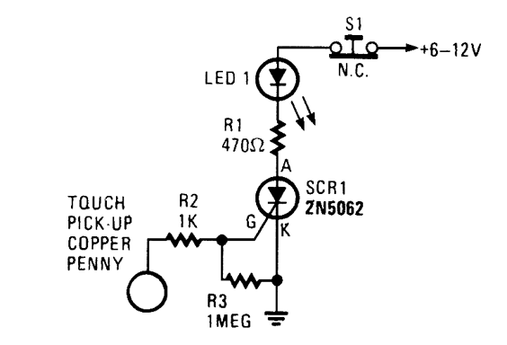 This touch on-only switch can be triggered into conduction by electrical means, and can only be reset by way of a mechanical switch. When the touch terminal is contacted by a finger, the SCR turns on and illuminates LED1.