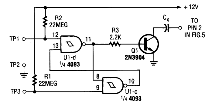 Two NAND Schmitt triggers are connected in a flip-flop configuration to produce a bridged touch-activated switch.