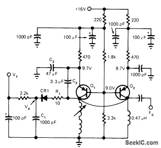 Tuning voltage V, in range of 0 to 7 V changes effective capacitance during peak positive portion of collector voltage cycle, to provide tuning over range of about 90 to 150 MHz. Reactance-switching HP 5082-3188 diode CR1 switches in additional capacitance for oscillator using Motorola 2N5208 transistors.-C. Weber, VCO Reactance Switching Provides Broad Tuning Range, EDN Magazine, March 20, 1977, p 151 and 153.