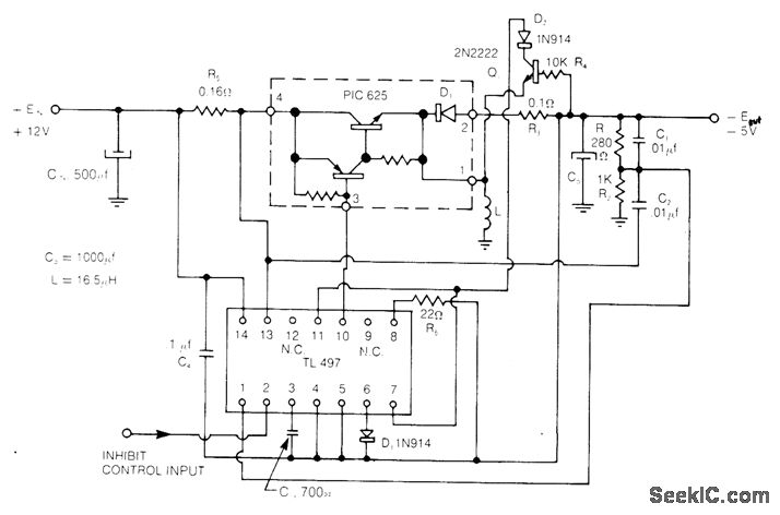 Uses Unitrode PIC625 regulator operating at 25 kHz and TL497 control circuit operating in current-limiting mode to give line and load regulation of 0.2% for input voltage of 12 V ±25%. Efficiency is 75%. Short-circuit current is automatically limited to 3 A.- Flyback and Boost Switching Regulator Design Guide, Unitrode, Watertown, MA, 1978, U-76, p 5.