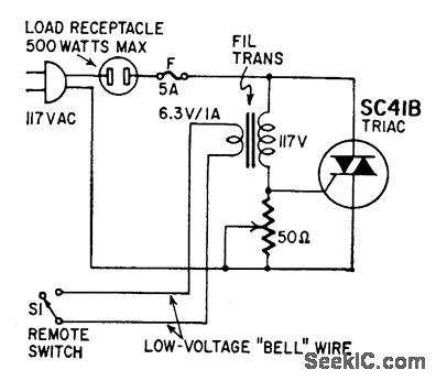 This circuit provides power control with-out running line-voltage switch leads. The primary of a 6-volt filament transformer is con-nected between the gate and one of the main terminals of a triac. The secondary is connected to the remote switch through ordinary low-voltage line. With switch open, transformer blocks gate current, prevents the triac from firing and applying power to the equipment. Closingthe switchshort-circuits the secondary, causing the transformer to saturate and trigger the triac. (View)