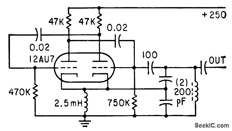 Free-running mvbr, half of which is connected us Colpitts oscillator, gives 1-Mc sine wave, 100% modulated by 15-cps square wave, for testing two-channel tachometer using radioactive sources-R. R. Bockemuehl und P. W. Wood, Unique Two-Channel Tachometer uses Radioisotopes, Electronics, 35:49, p 44-45.