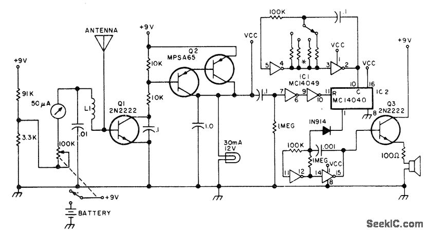 Switch gives choice of intervals from 0.5 to 5 min after going on air, before timeout alarm tone sounds. Circuit includes field-strength meter and on-the-air Iight. Releasing mike button for about 1 s resets timer, which consists of MC14049 hex inverter and MC14040 12-bit ripple counter. L1 is 3 tums No. 20 wire on 5/16-in form. Timing resistor values are 47Kfor 0.5 min, 100K for 1, 220K for 2, 390K for 3, and 510K for 5 min.-B. Fette, An FM Gadget, 73 Magazine, April1977, p 154-155.