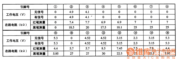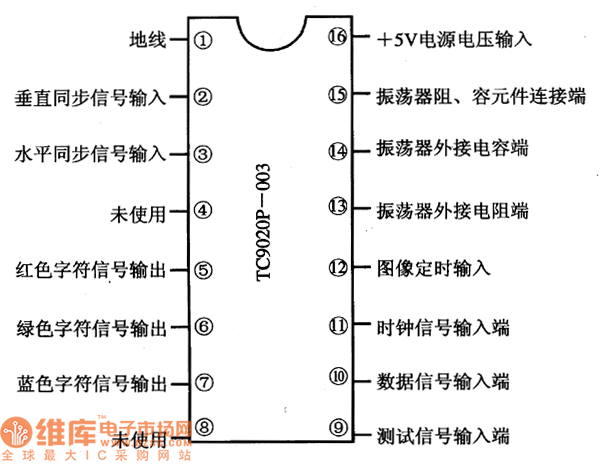 TC9020P-003 is an integrated circuit of letter display generator produced by Toshiba, which is widely used in many makes of local and imported color TV.1. Function features TC9020P-003 includes clock oscillator circuit, data input connector circuit, horizontal/vertical field locating and blank signal process circuit, etc.2.pin functions and dataTC9020P-003 is in 16-pin dual in-line package, whose pin functions are shown in Figure 1, and its parameters are listed in Table 1.Figure 1. The pin functions of TC9020P-003