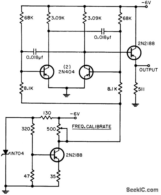 Designed for range of -70 to +70℃, for which circuit produces frequency change of 1.5 kc. Uses temperature-sensitive base-to-emitter voltage of transistor, which varies linearly with temperature, as transducer for voltage-controlled oscillator based on astable mvbr.-G. F. Ingle, Using Transistors for Temperature Measurement, EEE, 11:8, p 53-55.