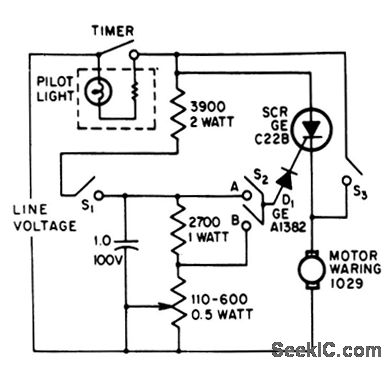 Single scr safely handles 7.5-amp current of 1/2-hp motor. Feedback is used to change firing angle of scr as load increases, to maintain constant blending speed.-J. Eimbinder, SCRs In The Consumer Market, FEE, 14:8, p 100-103.