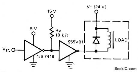 By using opencollector 7416 TTL interface with its output pulled up to 15V,S55V01 VMOS will switch up to 2 A easily. Inductive load such as relay requires diode across relay coil-L. Shaeffer, VMOS Peripheral Drivers Solve High Power Load Interface Problems, Computer Design,Dec.1977,p 90,94,and 96-98.
