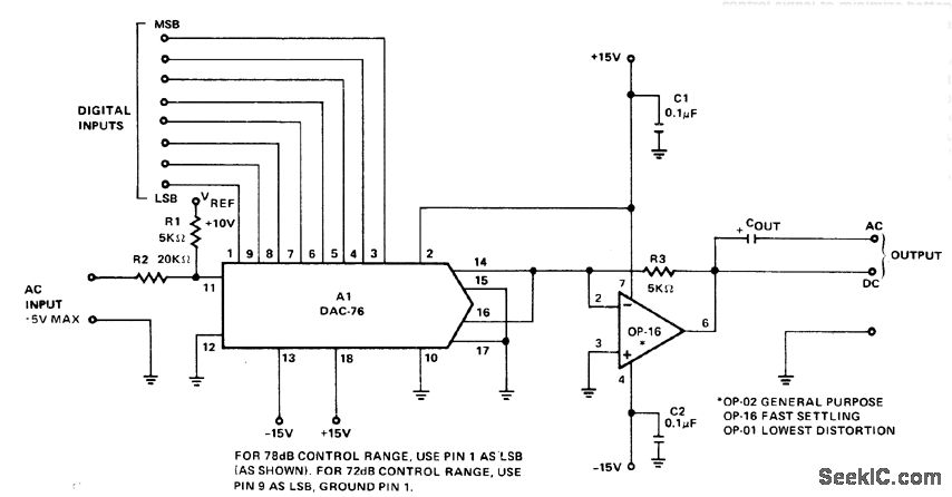 Decibel-weighted control characteristic of Pre-cision Monolithics DAC-76 DIA converter matches natural Ioudness sensitMty of human ear, to provide much greater useful dynamic range for controlling audio Ievel. Control range can be either 72 or 78 dB, depending on pin connections used. 8-bit word control input can be interfaced with standard TTL-compatible microprocessor outputs. To avoid annoying output transients during large or rapid gain changes, use clickless attenuatoriamplifier (also given in application noteļ¼.-W. Jung and VV.Ritmanich, Audio Applications for the DAC-76 Companding D/A Converter, Precision Mono-Iithics, Santa Clara, CA, 1977, AN-28 p 2.