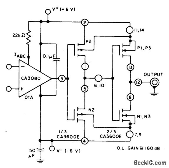 Connections shown for CA36OOE CMOS transistor-pair array give total open-loop gain of about 160 dB for system. Open-loop slew rate is about 65 V/μs.- Linear Integrated Circuits and MOS/FET's. RCA Solid State Division, Somerville, NJ, 1977, p278-279.