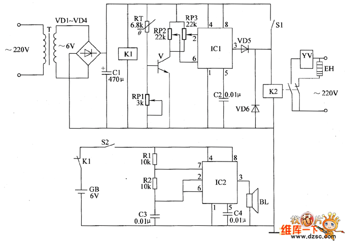 The bean sprouts automatic watering thermostats circuit is composed of the power supply circuit, temperature detection control circuit and power failure alarm circuit, and the circuit is shown as the chart. Temperature detection control circuit is composed of the thermistor RT, potentiometers RP1 ~ RP3, transistor V, time-base integrated circuit IC1 and capacitor C2, diodes VD5, VD6, relay K2 and the control switch S1 . Power failure alarm circuit consists of the relay K1, switch S2, resistors R1, R2, capacitors C3, C4, and speaker BL and the time-base integrated circuit IC2. R1 and R2 use 1/4W carbon film resistors or metal film resistors. RP1 ~ RP3 use small organic solid potentiometers or variable resistors. RT chooses the thermistor resistor with negative temperature coefficient.
