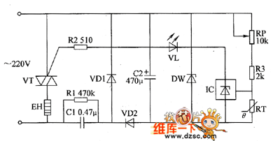 The power supply circuit is composed of the step-down capacitor C1, discharge resistor RI, rectifier diodes VD1, YD2, filter capacitor C2 and zener diode VS. Temperature detection control circuit is composed of the thermistor RT, resistors R2, R3, potentiometer RP, light-emitting diode YL, three-terminal precision regulator integrated circuit IC and thyristor VT. RI selects the l/2W metal film resistor: R2 and R3 select the l/4W metal film resistor. RP uses the multi-turn potentiometer. vs uses the 2DW7 silicon zener diode.