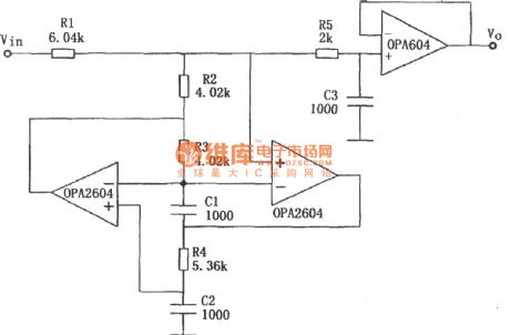 The circuit is showed in the piture above. The circuit makes use of a JFET-inputhigh-fidelityoperational amplifierOPA604 and a dualop ampOPA2604componentthird orderButterworthlow-pass filter. The parameter is showed in the picture. The cutoff frequency of-3dB is 40 KHz. (View)